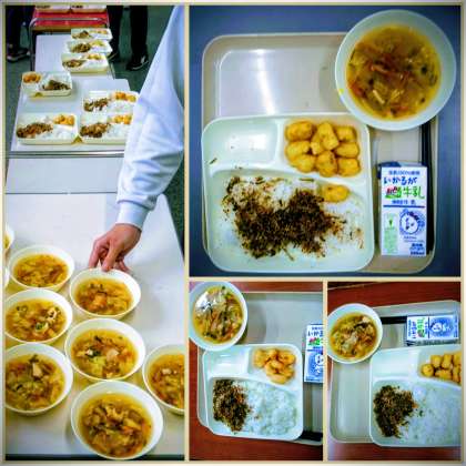 11月25日(火)、今日の給食献立は、ご飯、イカ天ぷら、おかか菜っ葉、五目汁、牛乳です。『イカ天ぷら』イカには、体をつくるもとになる「たんぱく質」が多く含まれています。また、かみ応えがあるのが特徴です。【今日の「イカ天ぷら」は、イカに小麦粉とでん粉で作った衣が付いたものを、給食室で揚げています。】エネルギー:779kcal。たんぱく質:29.4g。脂質:26.0g。糖質:104.0gでした。