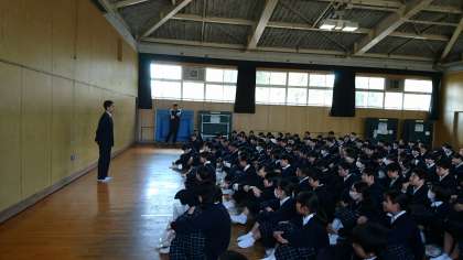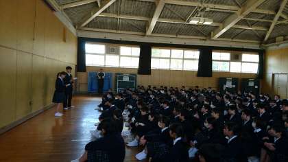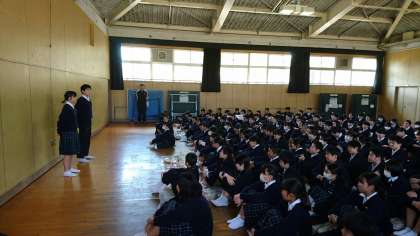 5時間目に小体育館で学年集会をしています。各クラスの目標などを発表しています。