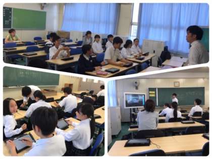 防災ALT、全学年を対象にタブレットを使用してパワーポイントを作る研修を行いました。村松先生が講師となり1年生は自己紹介、2,3年生は白鷺中学校の紹介のパワーポイトを実際に作ってみました。1年生は写真を撮り合い、2,3年生は操作の仕方を教え合ったりしていました。最後に3年生が、出来上がったパワーポイントで短いプレゼンテーションを行いました。写真やイラストを使って分かりやすい仕上がりでした。