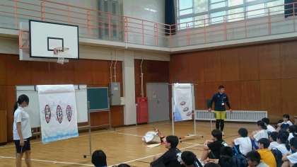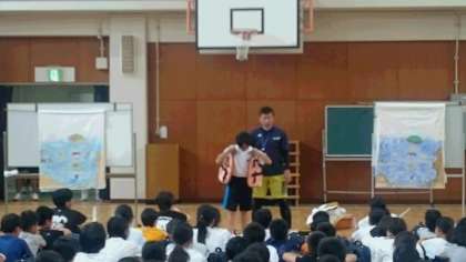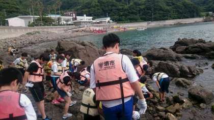 いよいよ活動開始!少年の家の方の説明をしっかりと聞き、カヌー・カヤック・磯観察の班に分かれて海に親しんでいます。