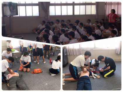 7/12(金)の午後に保健委員会と防災ALTのメンバー合同で、救命講習会を実施しました。