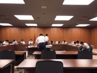 現在、大阪市役所内を見学し、6つの委員会に分かれて話し合いをしています。