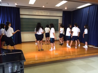 次に発声練習、柔軟体操、腹式呼吸をしました。