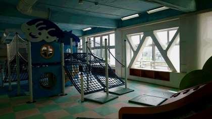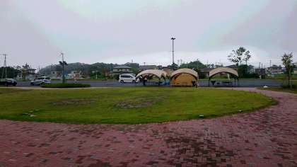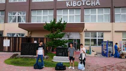 防災ALTの東北視察、最終日は晴れました!震災で傷ついた校舎を改築し、子どものための遊具や広いキャンプ場もある宿泊施設として再出発したキボッチャを出発。全員元気に今日の視察先に向かいます。