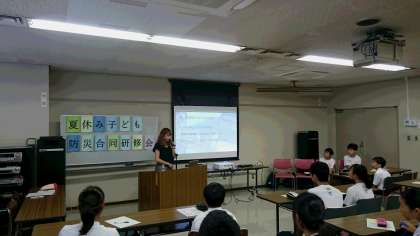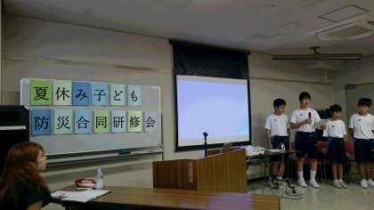 平野区画整理会館で、白鷺中防災ALTメンバーが司会・運営を担当し、夏休み子ども防災研修会を行いました。四つの中学校による防災学習についての活動報告と、防災・減災団体akariの安田もえさんによる講演・ワークショップがありました。違う学校の生徒と意見を交換し、防災についての意識を高めました。