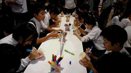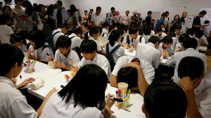 黄色団は池田のカップヌードルミュージアムに来ています。みな楽しそうに自分だけのカップに絵を描いているところです。