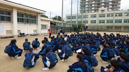 運動場に集合しています。天候が若干心配ですが、もうすぐ出発です。
