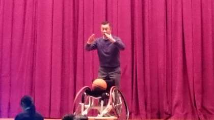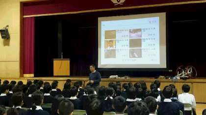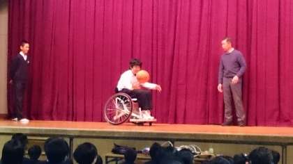 先週に高橋明さんに講話していただき、人権について理解を深めました。高橋さんはパラリンピック日本代表のコーチなどを歴任され、スポーツを通して障がいのある人もない人も「共に生きる」ことの大切さを伝えておられます。「障がいでできなくなったことを数えるのでなく、できることを見つける」という勇気の出る言葉を紹介していただきました。講話の終わりには、一年生も舞台上で車椅子バスケットボール用の車椅子を体験しました。一年生全体が真剣に聴き、とても良い時間になりました。相手を思いやる心を持ちながら、学校生活を送っていきましょう。
