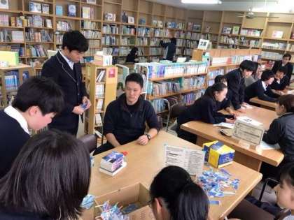 青い鯉のぼりのしおり作りを図書室で行いました。今日の作業は防災ALT・図書委員会以外の人も作業を手伝いに来てくれました。