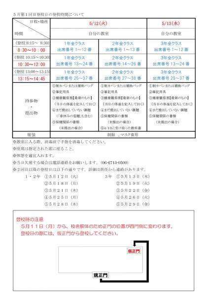 また、本校では、安全面に最大限配慮した上で、下記の通り登校日を設けますので、よろしくお願いいたします。
