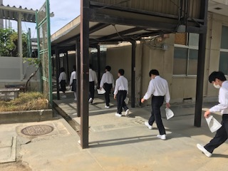 今日は登校日。分散登校1つ目の班の人たちが活動中です。写真は1年生が校舎見学をしているところです。
