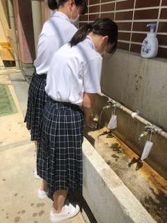 毎授業後の手洗いは、極力密な状況を避けるために、クラスごとに時間、場所を決めておこなっています。来週からは人数が倍になるし、みんなで気をつけていきましょう。