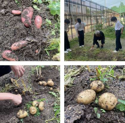 飼育園芸部の今年度初の部活動として、元気アップボランティアの方からソーシャルディスタンスの説明を聞いたあと、じゅがいもの収穫をしました。