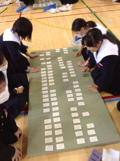 本日、5,6限の総合の時間に、体育館で『クラス対抗・百人一首大会』をしました。この時間、この対決のために、先週から学級活動の時間などをつかって練習してきました!