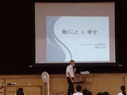 土曜授業では、ヒューマンキャンパスアカデミー高校の川島浩先生に「働くことと幸せ」についてお話をしていただきました。「サラリーマンと社長、どっちが幸せ?」などの導入から、内面の幸せは自分で決めるものなので、働く意味について考え続けなければいけない、というお話に、生徒たちは興味を持って聞いていました。