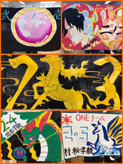 明日の体育大会を盛り上げる、2年各クラスの学級旗です。それぞれの団の色をベースに、クラスで仕上げました!優勝するのは、どのクラスでしょうか?