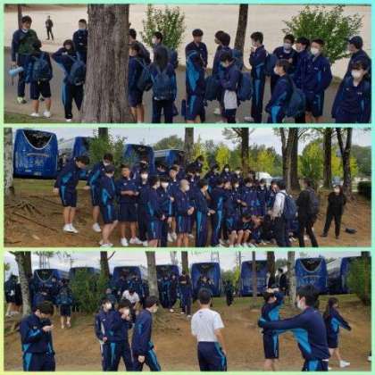 > 飯田運動公園に着きました。 > 時間通りです。クラス写真を撮ってます。