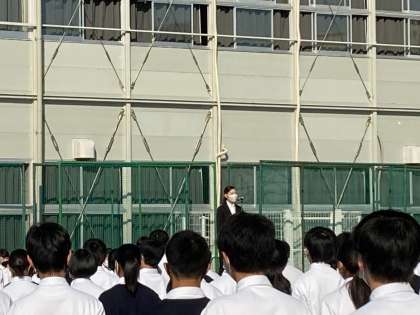 水曜日、全校集会を行いました。これから水曜日ごとに白鷺中にいらっしゃる、インターンシップ生の西郷先生に挨拶をしていただきました。