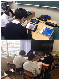 テストが近づいてきました。上の写真は、1年社会科Aでタブレットを使い「すららドリル」に取り組んでいるところ、下の写真は、3年社会科Bで班活動をしているところです。