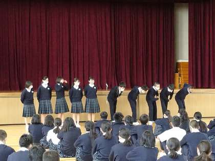 その後、委員長のみなさんが前に出てきて授業を良くする呼びかけを行ってくれました。「全集中・授業の呼吸、メリハリ!!」 学年全員で良い授業にしていきましょう。