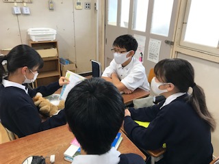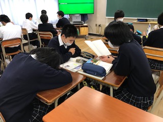 1年生社会科Aでグループに分かれて、期末テスト範囲の復習をしているところです。現在、社会科Aでは地理、社会科Bでは歴史を勉強しています。