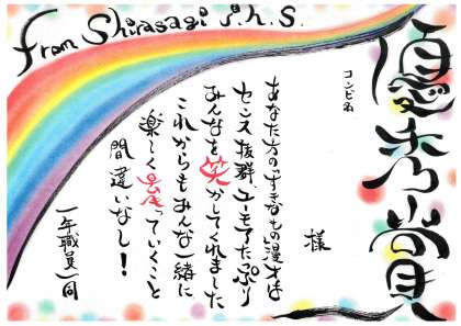 手作りの賞状とメダルの授与です。1年生のみなさん、本当によくがんばりました。お疲れさまでした。