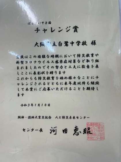令和2年度1・17防災未来賞「ぼうさい甲子園」において「チャレンジ賞」を受賞しました。上位の賞の入賞とはなりませんでしたが新型コロナウィルス感染症の感染拡大の状況下でも防災の取組を続けていることに対する賞です。