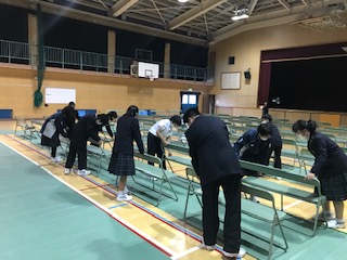 本日、新入生保護者説明会があります。1年生の委員長と体育委員の人たちが昼休み返上で、体育館の会場準備をしてくれました。みんなキビキビと動き、それぞれの成長を感じました。みんなありがとう。
