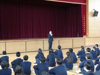 始業式の後、3年生は体育館に移動し、新しい学年に上がって最初の学年集会を行いました。新しく学年の担当になった先生が自己紹介し、江角先生が「1・2年生の時から先生たちが話してきたことに注意して、3年生の一年間を過ごしてほしい。このメンバーで良かった、と思える一年間にしたいです」と全体に話をしました。