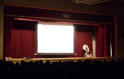 3月4日午後、1,2年生も参加して本校体育館で開かれました。講師は大阪体育大学客員教授の高橋明先生、パラリンピックに全日本の車椅子女子バスケットボールを総監督として何度も連れて行かれた有名な方です。