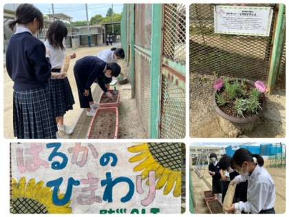 防災ALTの1、2年生で阪神淡路大震災に由来する「はるかのひまわり」の種植えをしました。昨年、白鷺中学校で咲いたひまわりの種を2つのプランターに植え、残りのプランターには2年間交流を続けた高知県四万十市立蕨岡中学校と交換して送ってもらったはるかのひまわりの種を植えました。