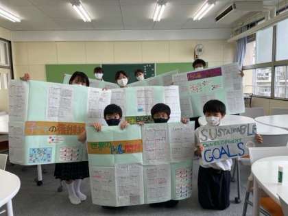1年生の皆さんが書いたSDGsに関するミニレポートの掲示物が完成しました!委員長の皆さんがレイアウトを考えて仕上げをしてくれて素敵な展示作品になりました。委員長の皆さんがありがとう〜〜!