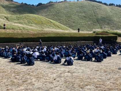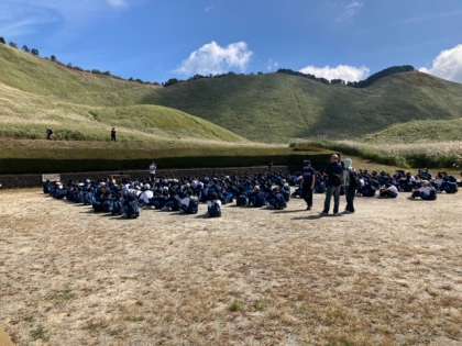 一年生はお昼ご飯を食べて、ハイキングの説明を受けています!