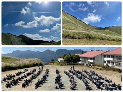 集合写真のみんなの手は「55」です。山の達人吉谷先生のアドバイスをしっかり聞いて、出発します。さわやかな曽爾高原の秋を満喫してきます。