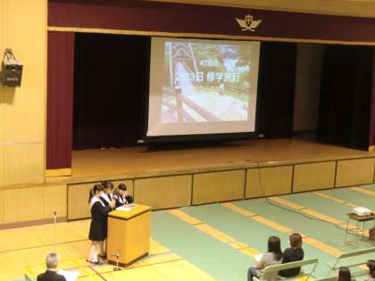 教員の説明に先立ち、3人の修学旅行委員の生徒が前に立ち、ipadを使って3日間の行程をプレゼンテーションしてくれました。スライドも、修学旅行委員が事前に作成したものです。写真だけでなく文字やアニメーションなども付けながら、わかりやすく伝える工夫が多くされていました。保護者の方や教職員が見守る中、見事に堂々と発表してくれました。