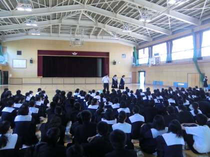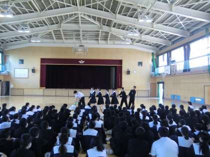 5月1日の学年集会で、修学旅行委員から修学旅行2日目、ホテルでの夜レクの内容が発表されました。各クラスで、5分程度の劇を行います。