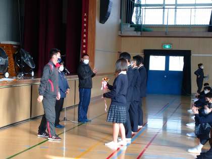 本日、体育館で学年集会を行いました。体育大会の表彰をしました。優勝した4組をはじめ、競技を頑張ったみなさん、素晴らしい学級旗を作り上げたみなさん、お疲れ様でした。