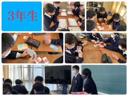 1時間目ーLINEみらい財団の一ノ瀬先生の情報防災訓練。2時間目ー阪神淡路大震災の体験をもとに作られたクロスロードゲーム。3時間目ー防災リュックの中身を考えるオリジナルカードゲーム。防災ALTのメンバーが事前にゲーム準備、進行も担当しました。3年生の皆さんはゲームを楽しみながら、災害時の判断の難しさ多様な考え方があることを学び、「普段の備え」を考えることにつながりました。「学び」を「防災の行動」に!!
