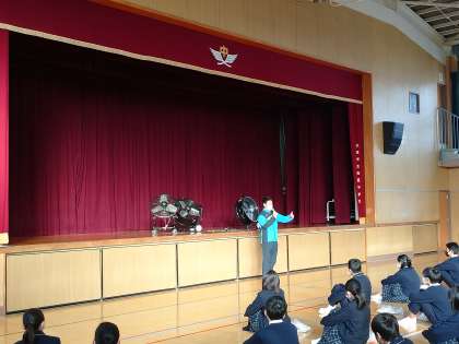 本日、体育館で学年集会を行いました。江角先生が、心理学の「ハロー効果」に例えて、入試関係の提出書類を丁寧に仕上げよう、という話をしました。