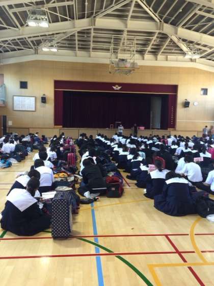 体育館で5時間目に持ち物と、しおりの確認を行いました。そろっていない物は、土日で必ず準備しましょうね。
