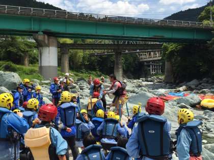 そうこうしている間に吉野川に到着 天気にも恵まれ、絶好のラフティング日和! ウェットスーツを着ると暑いぐらいでしたが、川の水は少しひんやりとしていて、みんな気持ち良さようでした