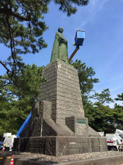 真ん中の写真は龍馬像です。この前でクラス写真を撮りました。また、横にクレーンがありますが、ガイドさんの話によると、龍馬像建立の除幕式は昭和3年の5月27日!!そんな所以で、今日小学生が磨きに来ていたんだって。テレビカメラも来ていましたね!