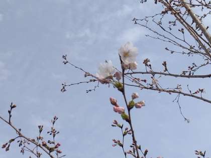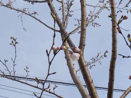1年生のソメイヨシノ、初々しい花びらが青空に映えます