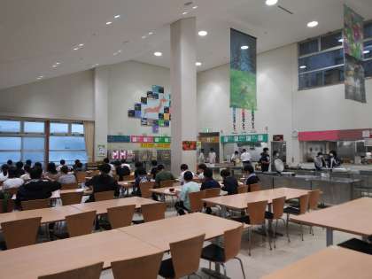 夕食と入浴を交替で進めています。食事はバイキング方式です。