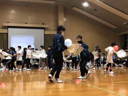 2枚目:1日目夜の室内五輪、「風船リレー」のようすです。