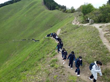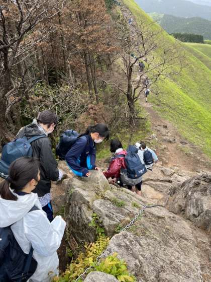 1枚目:ハイキングの様子です。手をつかないと降りられないような急な崖もありました。