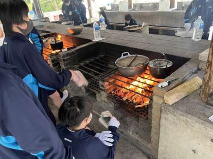 3枚目:野外炊事の様子です。火おこしに苦戦しまたが、班によって個性のあるおいしいカレーを作ることができました。
