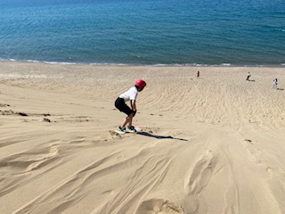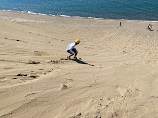 鳥取砂丘の急斜面をボードで滑走。みんな、あっという間に滑れるようになりました。