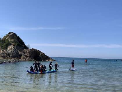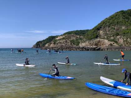 SUP(スタンドアップペダルボート)体験中です。昨日に続いて快晴のSUP日和です。