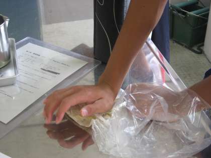 2年生の初めての調理実習で簡単パンを作りました。ビニール袋に入れて、粘土感覚でこねるだけのものですが、生徒たちはとても楽しそうに一生懸命作っていました。